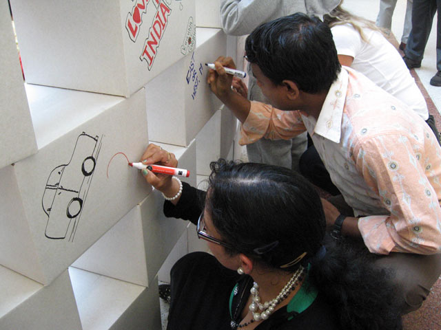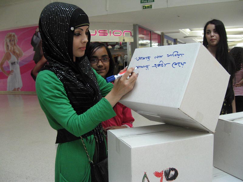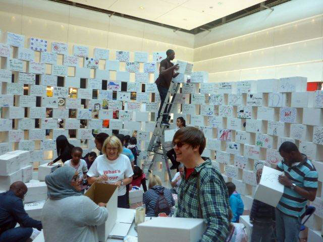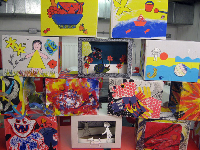Teachers at participating schools were invited to a training session aimed at encouraging creative expression and free thinking in art. Over 1000 students across the borough were then helped to personalise boxes which were brought together in two large scale installations celebrating creativity, individuality and ‘thinking outside the box’. Assisted by Sarah Pimenta.