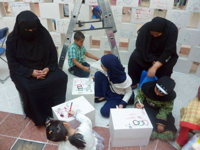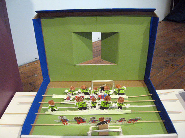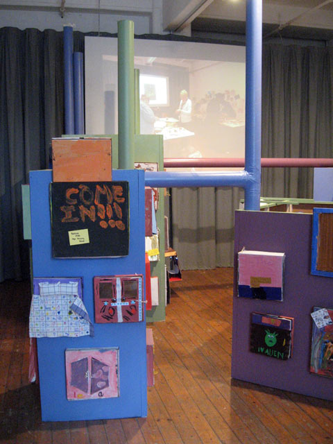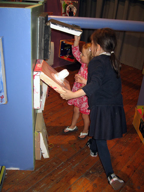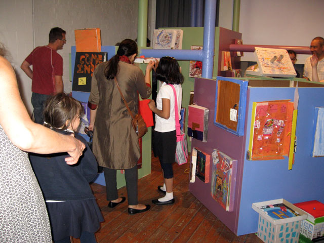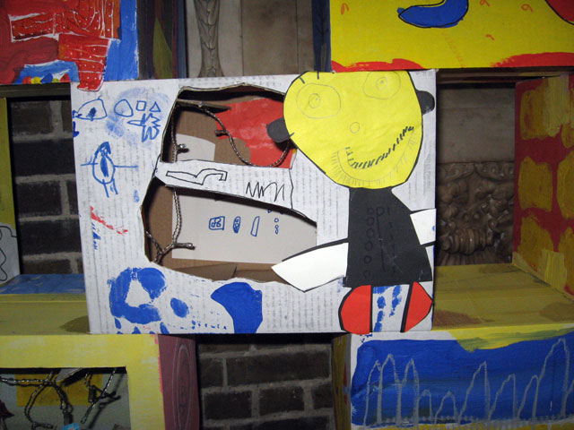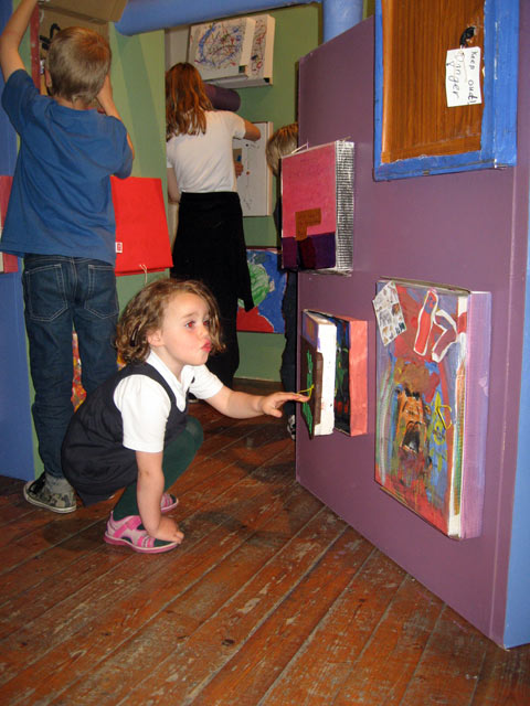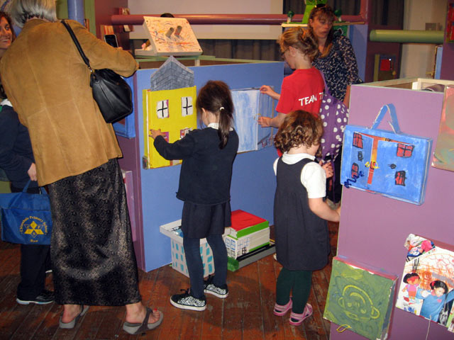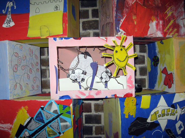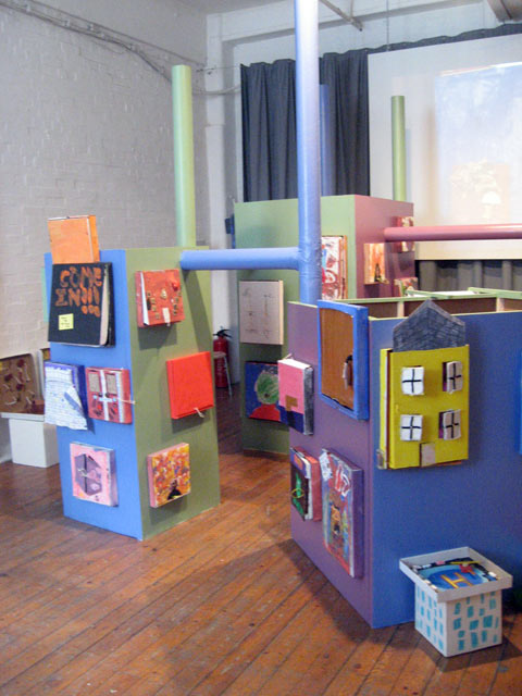 Based on the idea of a miniature city, the installation was built in the education space at the Chisenhale Gallery. KSI and II children from 6 schools contributed. Viewers were encouraged to wander amongst the child-scale structures, opening windows and peering into the interior imagined worlds the children had created during their art clubs. The project was funded by Tower Hamlets Extended Schools Services to encourage sustained out-of-hours art provision.