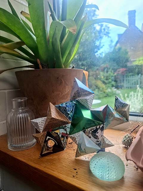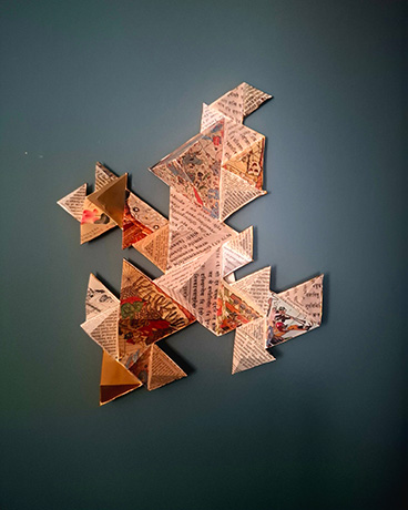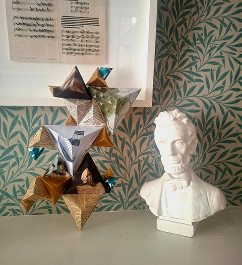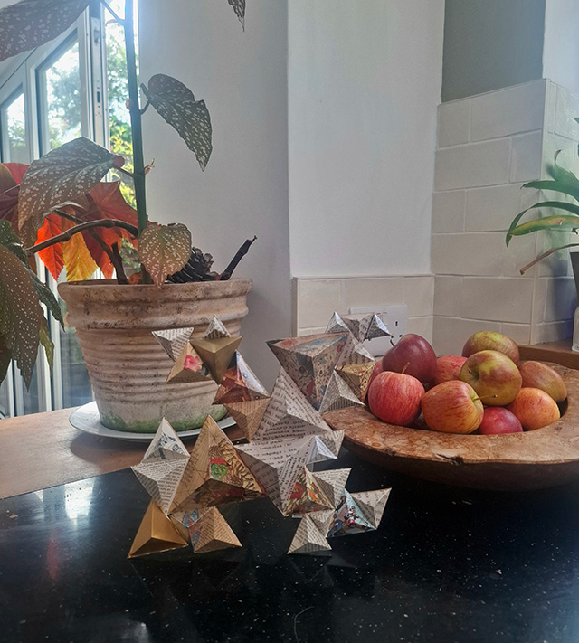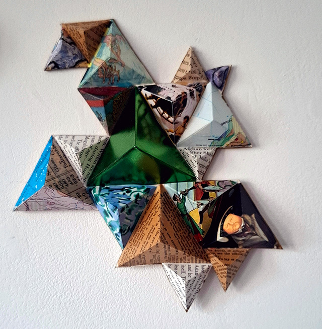 Born from the oddments and treasured snippets of text scattered around my studio, these tiny paper pyramids grew into a family of one-of-a-kind sculptures. Perched on mountboard and made at joyful speed, each piece had its own little personality. They were created as quirky gifts and pocket-sized artworks—mini 3D collage worlds ready to live on a wall, a fridge, or wherever they chose to land.