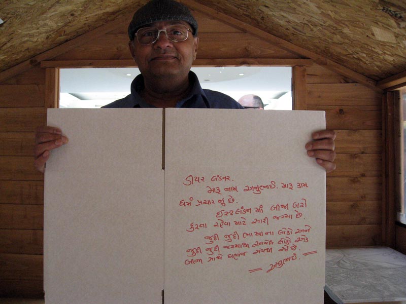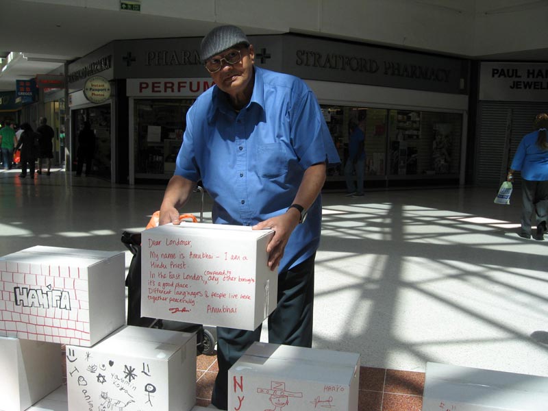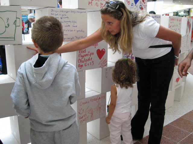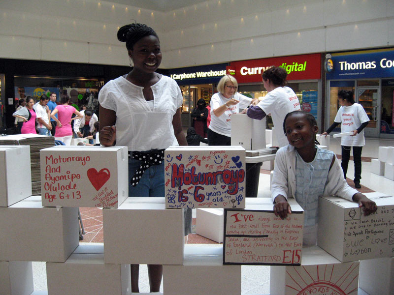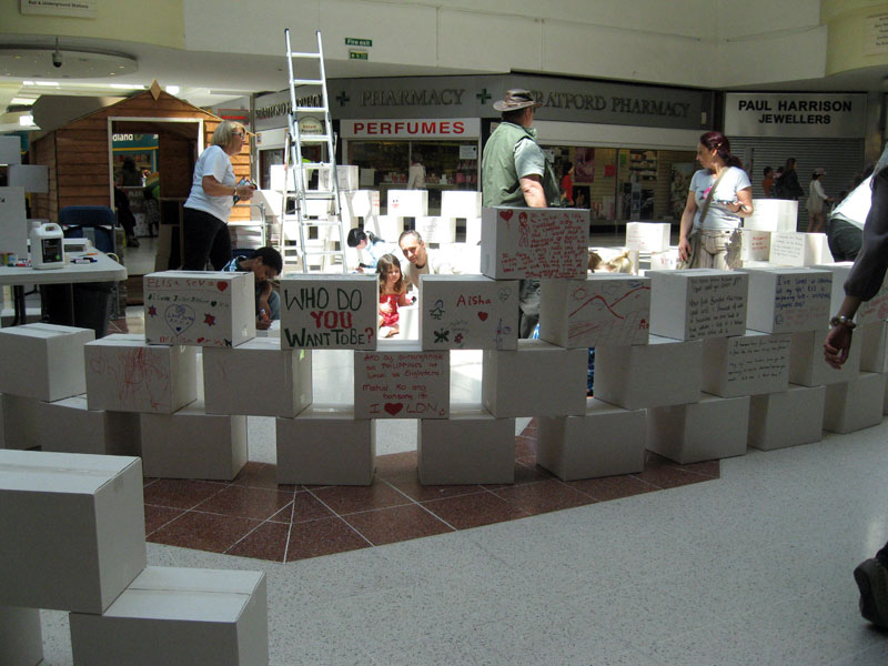 Built over 6 hours for Stratford Shedspace Festival; busy commuters and shoppers at Stratford Mall were stopped and asked to go through a ‘writing-space’ shed and respond to the question, then add their ‘brick’ to a large spiral structure on the other side. Over 500 passers-by contributed, many coming back to watch the structure grow over the day. The responses were hugely varied and immediate, from a vastly diverse community, written and drawn in many languages and by all ages. The project was sponsored by Stratford Rising Consortium and was intended as a simple platform for response and opinion in a quickly changing area.